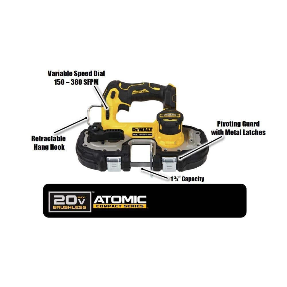This 20-Volt MAX Brushless Compact 2-Tool Combo Kit includes 1 cordless Drill/Driver, 1 cordless Impact Driver, two 20-Volt MAX Lithium Ion Batteries, 1 charger and a carrying bag. At only 5.1 in. front to back, the cordless Impact Driver features a high performance brushless motor that delivers 1700 in./lbs. of torque and 3 LED lights to provide optimum illumination in dark spaces as you work. The cordless Drill/Driver features a high performance brushless motor that delivers 340 unit watts outs (UWO) and LED foot light to provide optimum illumination in dark spaces as you work. Both tools feature an ergonomic design for balance and easier tool control along with removable belt hooks. Tools are backed by a DEWALT 3-year limited warranty so you can buy with confidence. This Compact Bandsaw DCS377B is lightweight at 6.6 lbs. with an integrated guard, making it ideal for overhead and 1-handed cutting applications.