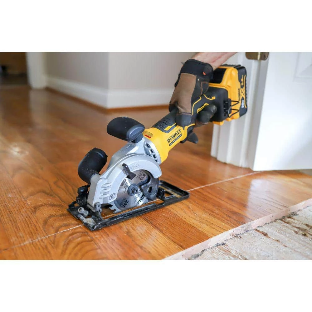 The DEWALT DCS571 Brushless 4-1/2 in. Cordless Circular Saw comes with 1 blade, rip fence, dust port adaptor, and blade change key. This handheld circular saw features a bevel gear design allowing users to cut 2X material at 90 degree and 1X material at 45 degree . With convenient on-board blade key storage, users can change blades with minimal hassle. Elongated handle optimizes reach for rip cutting OSB and plywood. The DCS571 is part of the DEWALT ATOMIC range and is 37% lighter than previous battery-powered circular saw models. This makes it easier to use for longer with greater control and less user fatigue. With the DCB205 Lithium Ion battery pack, this cordless saw can cut up to 339 lin. ft. of 3/4 in. OSB. The DCS571 Cordless Circular Saw comes covered by a DEWALT 3-year limited warranty for your additional peace of mind. Battery and charger sold separately.