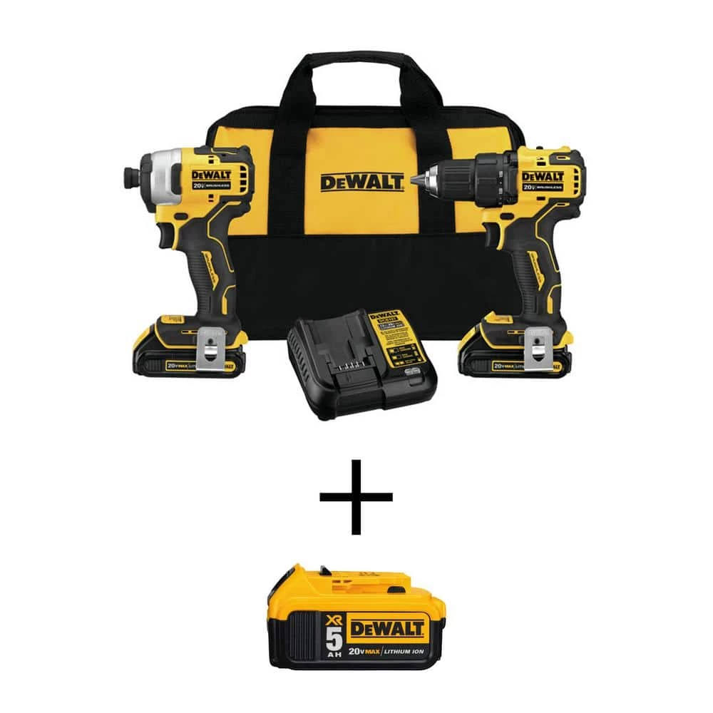 - Includes 1 DEWALT DCD708B ATOMIC 20-Volt MAX compact 1/2 in. cordless drill/driver, 1 DEWALT DCF809B ATOMIC 20-Volt MAX compact 1/4 in. cordless impact driver, two 20-Volt MAX lithium-ion 1.3 Ah battery packs, 20-Volt MAX charger and contractor bag