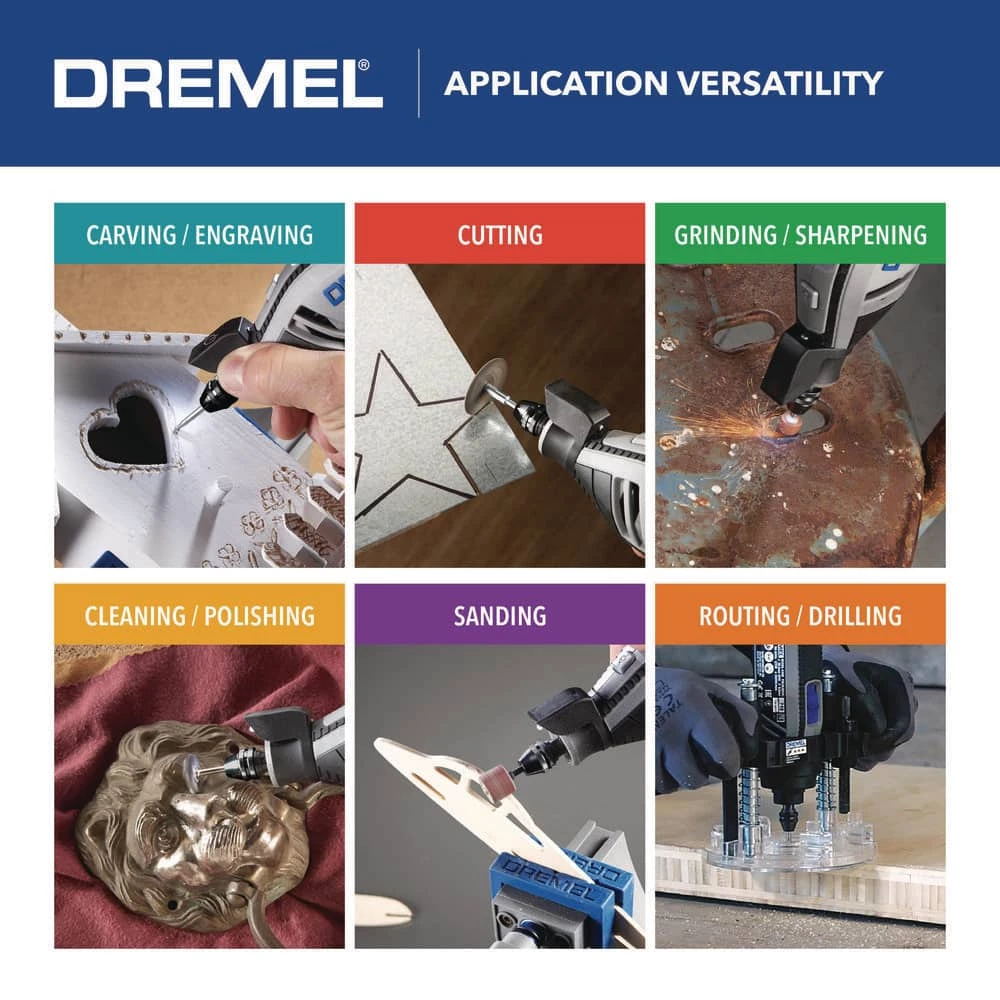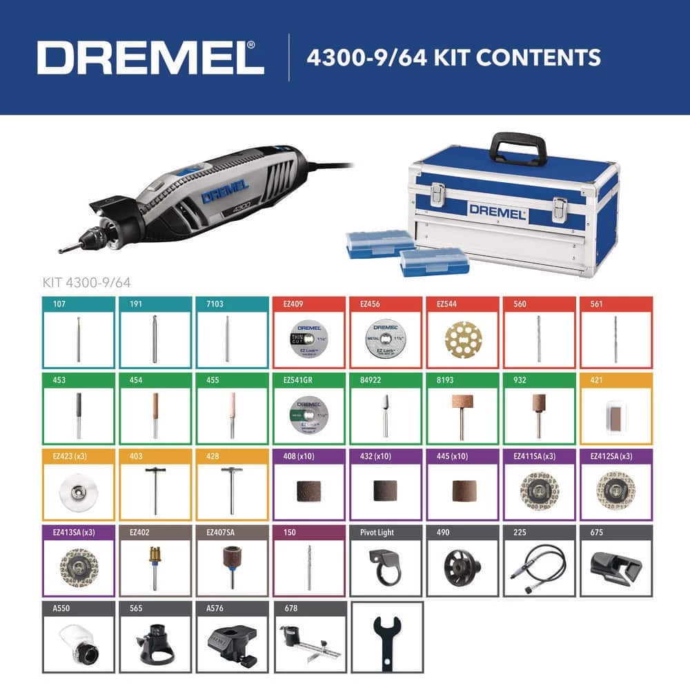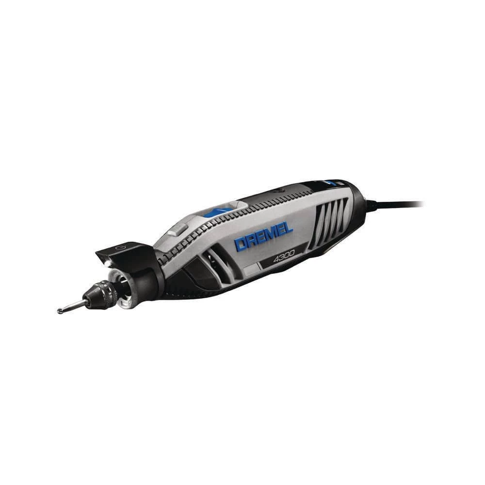 The Dremel 4300 is the first Dremel rotary tool to allow tool-less and collet-less accessory changes with the inclusion of the three-jaw chuck. The chuck accepts all Dremel accessory shank sizes for fast and convenient accessory changes without ever using a wrench. Featuring the all new Pivot Light, your projects are well-lit with an optimum line of sight since the light pivots to direct illumination where you want it. Experiencing the full range of Dremel rotary tool applications is easier than ever because the 4300 offers our most powerful motor with built-in variable speed and electronic feedback circuitry. And the slim, ergonomic body design provides a comfortable 360 degrees grip zone no matter how you hold it for extended ease of use. The completely redesigned airflow system lets the Dremel 4300 run cool, quiet and smooth so completing projects are more enjoyable than ever.