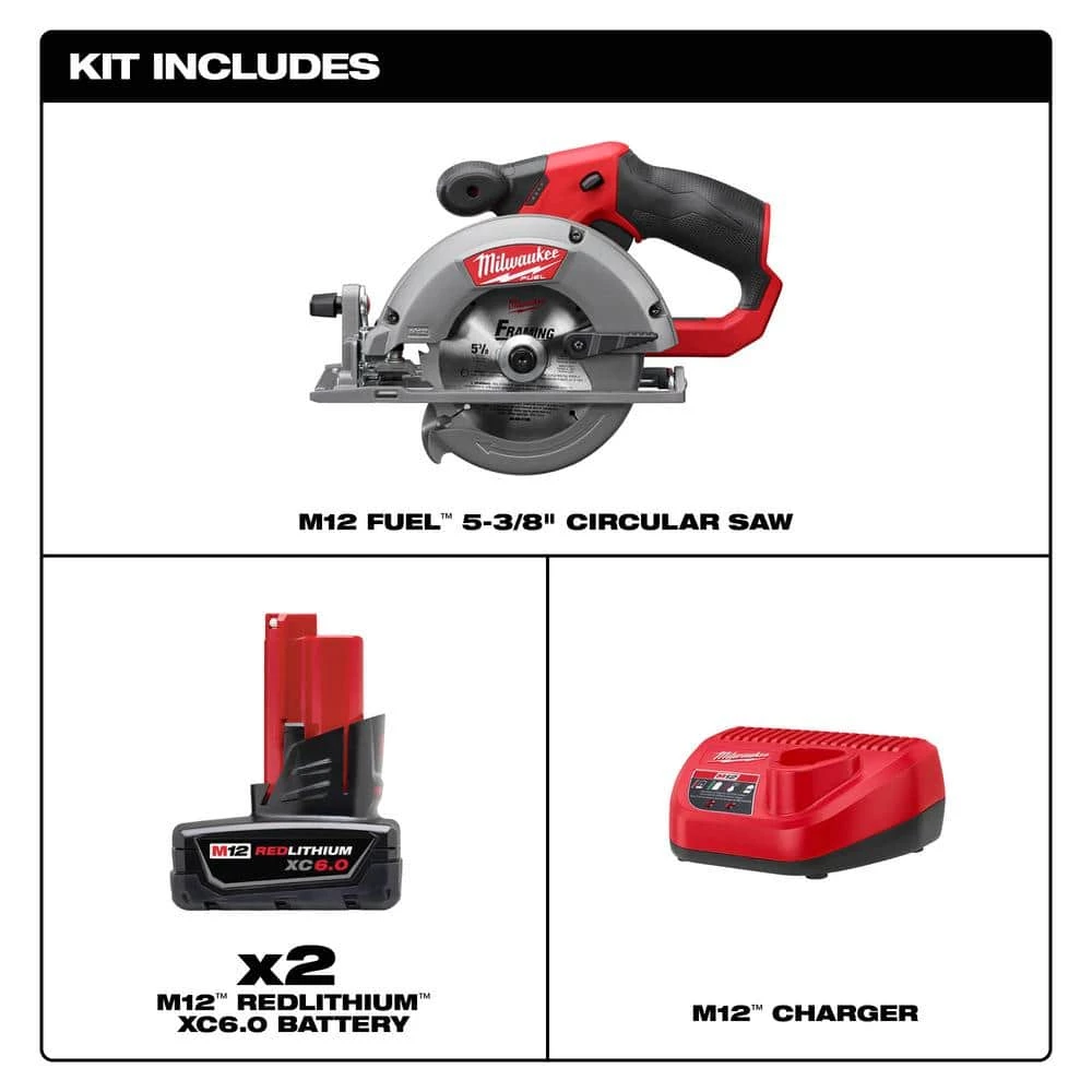 Milwaukee M12 FUEL 12V Li-Ion Brushless Cordless 5-3/8 in. Circular Saw and Blade with Two M12 6.0 Ah Battery Packs & Charger
