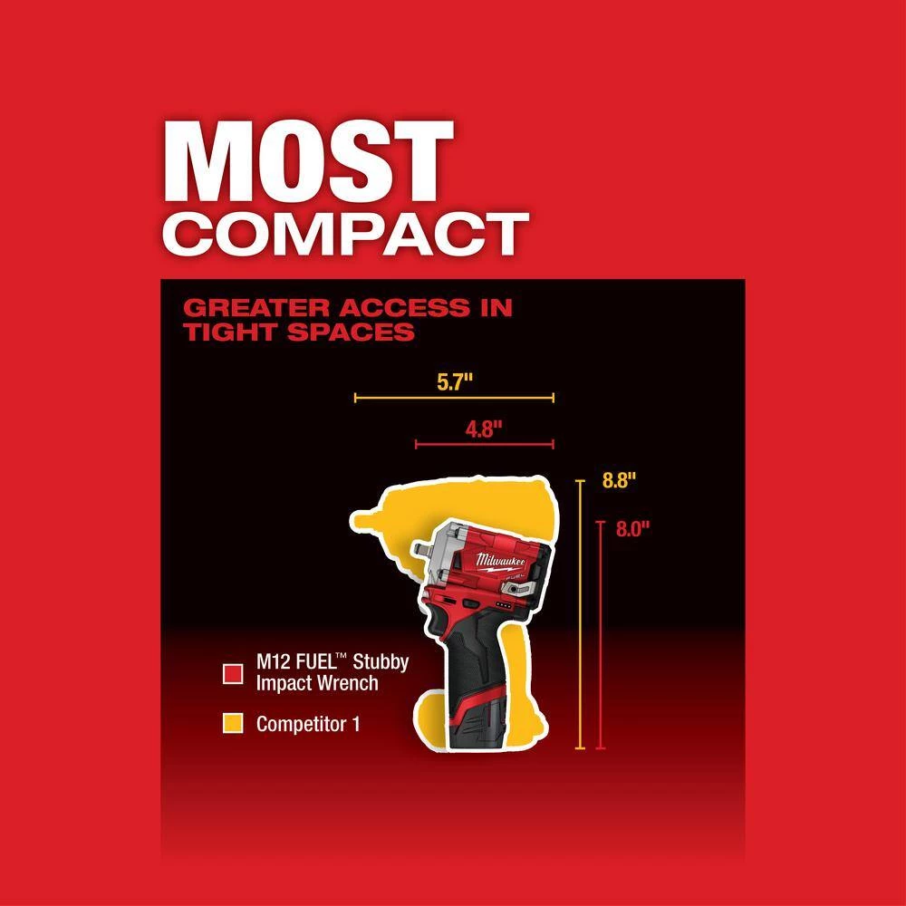 - Includes M12 FUEL stubby 3/8 in. impact wrench 2554-20, M12 4.0AH battery 48-11-2440, M12 2.0AH battery 48-11-2420, M12 charger 48-59-2401, one M12 service and repair flood light with USB charging 2367-20 and bag