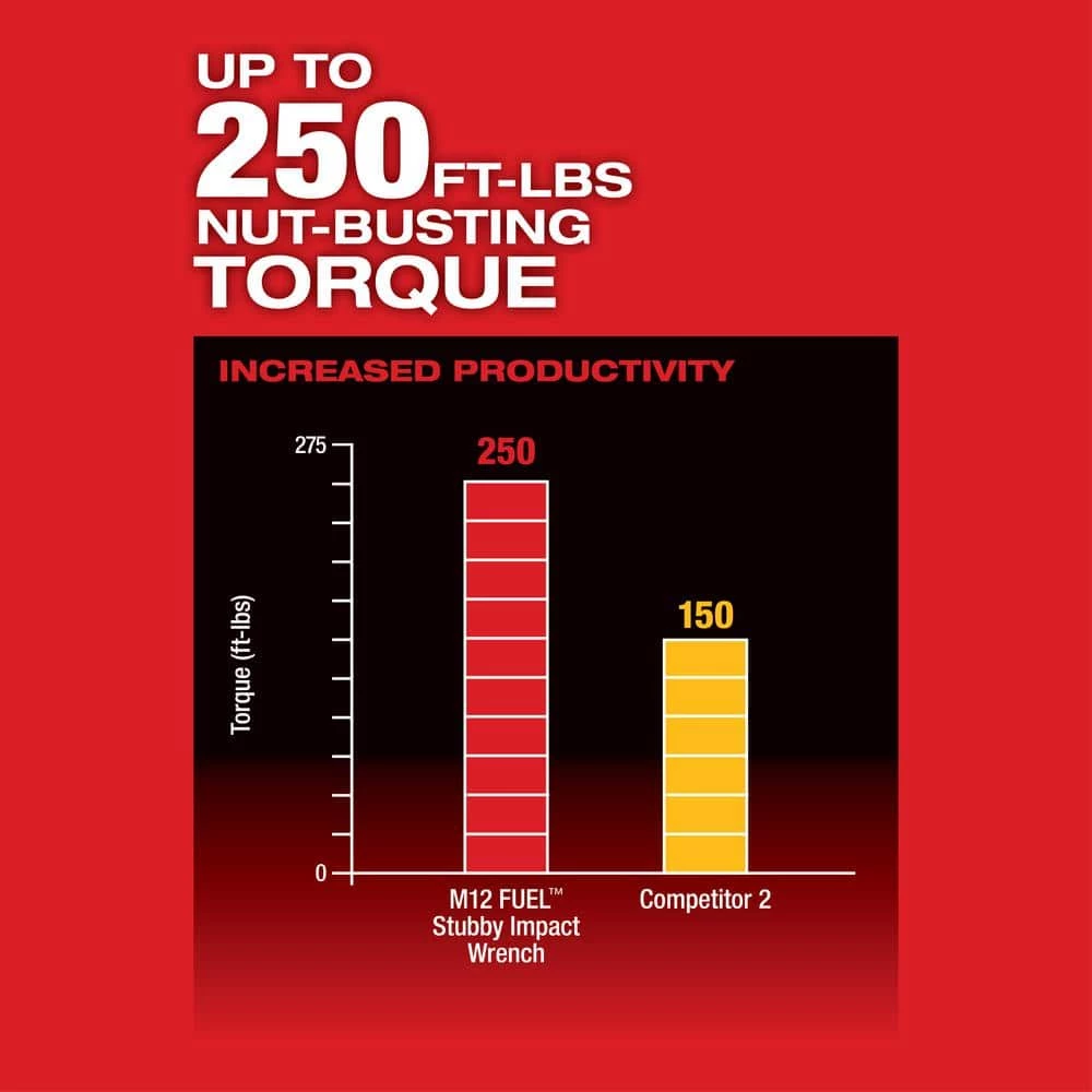 The M12 FUEL Cordless Brushless 3/8 in. Stubby Impact Wrench is the industries most compact impact wrench on the market place. Measuring only 4.8 in. L, this tool fits in tighter spaces, making users more productive. Increased torque delivers an industry leading 250 ft./lbs. of breakaway torque, removing even the most stubborn bolts and fasteners. 4-Mode Drive Control, will allow unmatched control in various fastening applications. 1 RPM to 3 RPM allows for precision control, and Auto-Shut Off Mode in the 4th setting will prevent over fastening of bolts while doing reassembly work. The Milwaukee M12 REDLITHIUM XC 6.0 Battery Pack delivers up to 3X more runtime, 20% more power and 2X more recharges than standard lithium-ion batteries. The lithium-ion battery pack features superior pack construction, electronics, and performance providing users more work per charge and more work over pack life than any battery on the market.