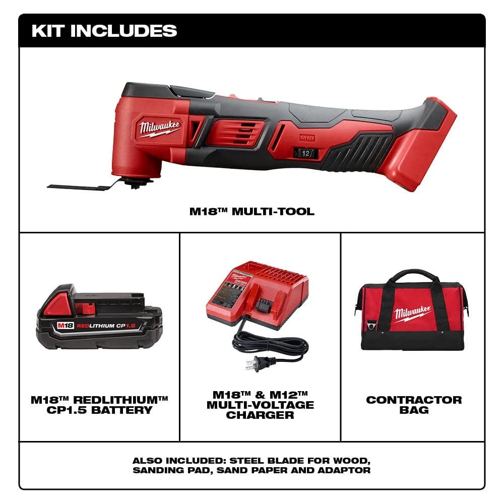 - Includes: (1) M18 multi-tool (2626-20), (1) M18 CP battery (48-11-1815), (1) M18 and M12 charger (48-59-1812)