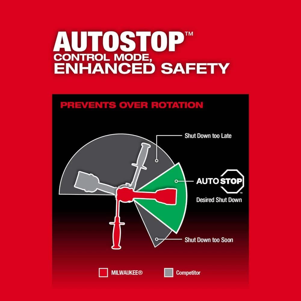 - Auto-stop feature to protect from over-rotation in a bind-up for enhanced safety, equipped with a dedicated autostop light on foot of tool to indicate a protection event