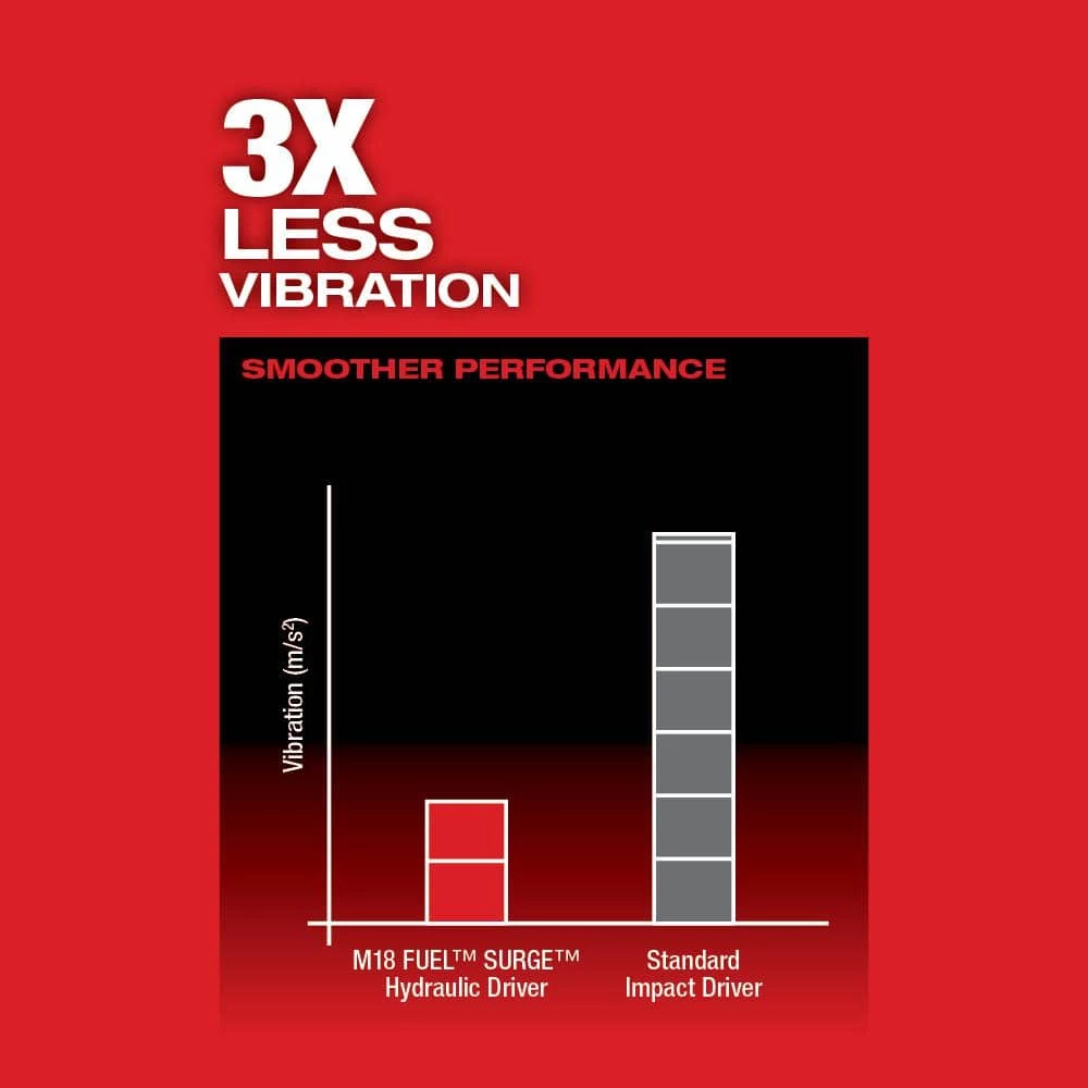 The M18 FUEL SURGE 1/4 in. Hex Hydraulic Driver is the quietest cordless fastening solution on the market. With Milwaukee’s new FLUID-DRIVE Hydraulic Powertrain, users will experience up to 50% quieter operation, 3X less vibration for smoother operation and faster driving speeds compared to standard impacts. The POWERSTATE Brushless Motor delivers up to 0-3,000 RPM with constant power output to drive screws faster. REDLINK PLUS Intelligence is the most advanced Electronic system on the market, preventing damage to the tool and battery caused by overloading or overheating. For use with REDLITHIUM Compact Batteries or Extended Capacity Batteries (sold separately), which deliver more work per charge and more work over the life of the pack than competitive batteries on the market. The 4-Mode DRIVE CONTROL provides greater control over output speed and power for greater versatility. Self-Tapping Screw Mode is designed to reduce walking when starting self-tapping screws as well as reduce overdriving, breaking and stripping out screws. Our M18 Dual Bay Simultaneous Rapid Charger is capable of charging 2 batteries at once, over 3X faster than standard sequential chargers. The charger accepts all Milwaukee M18 batteries. Our M18 REDLITHIUM XC5.0 Battery delivers up to 2.5X more runtime, 20% more power and 2X more recharges than standard lithium-ion batteries.