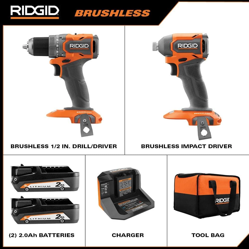 - Includes: (1) R87012 18V SubCompact Brushless 1/2 in. Drill/Driver, (1) R872311 18V SubCompact Brushless 4-Mode Impact Driver, (2) 2.0 Ah Batteries, (1) 18V Charger, (2) belt hooks with screws, (2) bit holders with screws, (2) driving bits, tool bag, and operator’s manual
